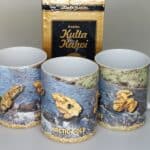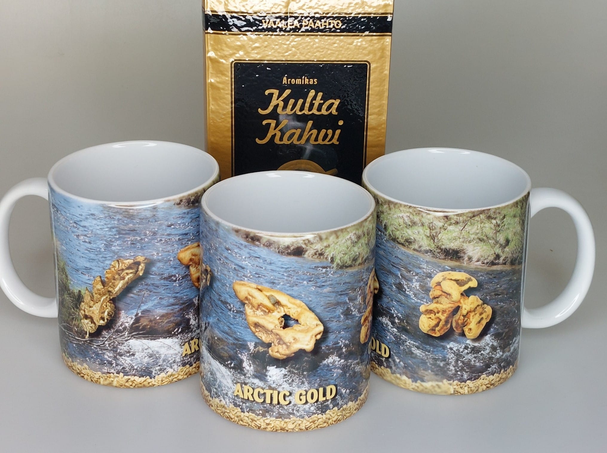 Mukissa on kolme isomushippua; 11 ja 45 g Sotajoelta sekä 8 g Lemmenjoelta. Purokuva on Laaninojalta ja mukin alareunassa on vaskaushippuja Moberginojalta. Hinta 14,20 €