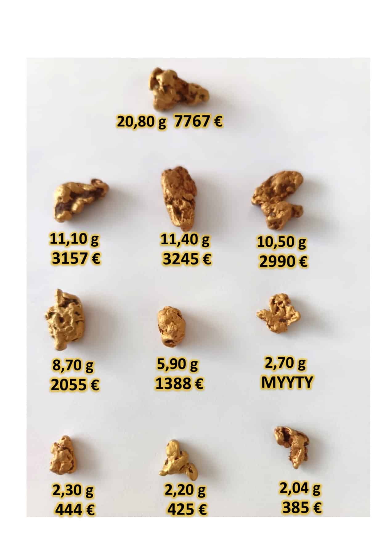 Vaskoolissa on parin viime kesän aikana löytyneitä ISOMUKSIA sekä sormenpään kokoisia kultahippuja Sotajoelta. Tarjoamme näistä kymmenen (katso lisäkuvista) kultahippua myyntiin. Tämän kokoisia hippuja on harvoin saatavilla.
