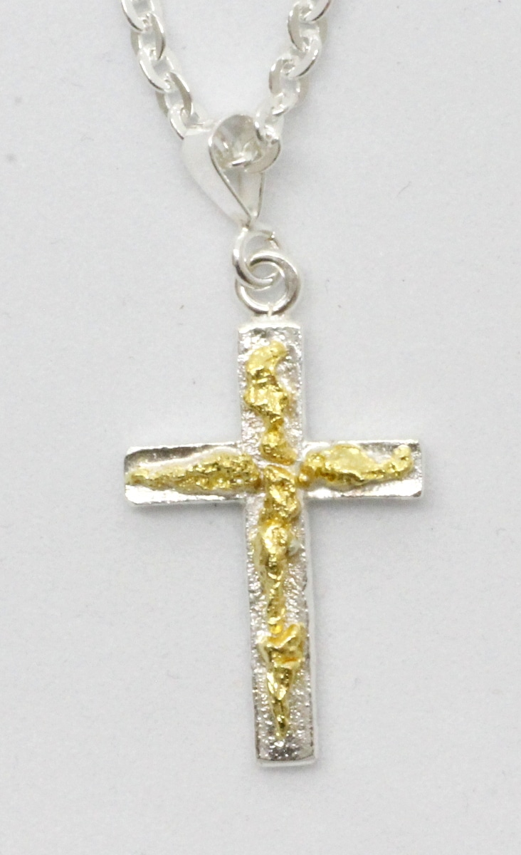 Osta tästä hieno kultasepän käsityönäyte Hopea-Kultahippuristi hopeaketjulla. Anna lahjaksi.