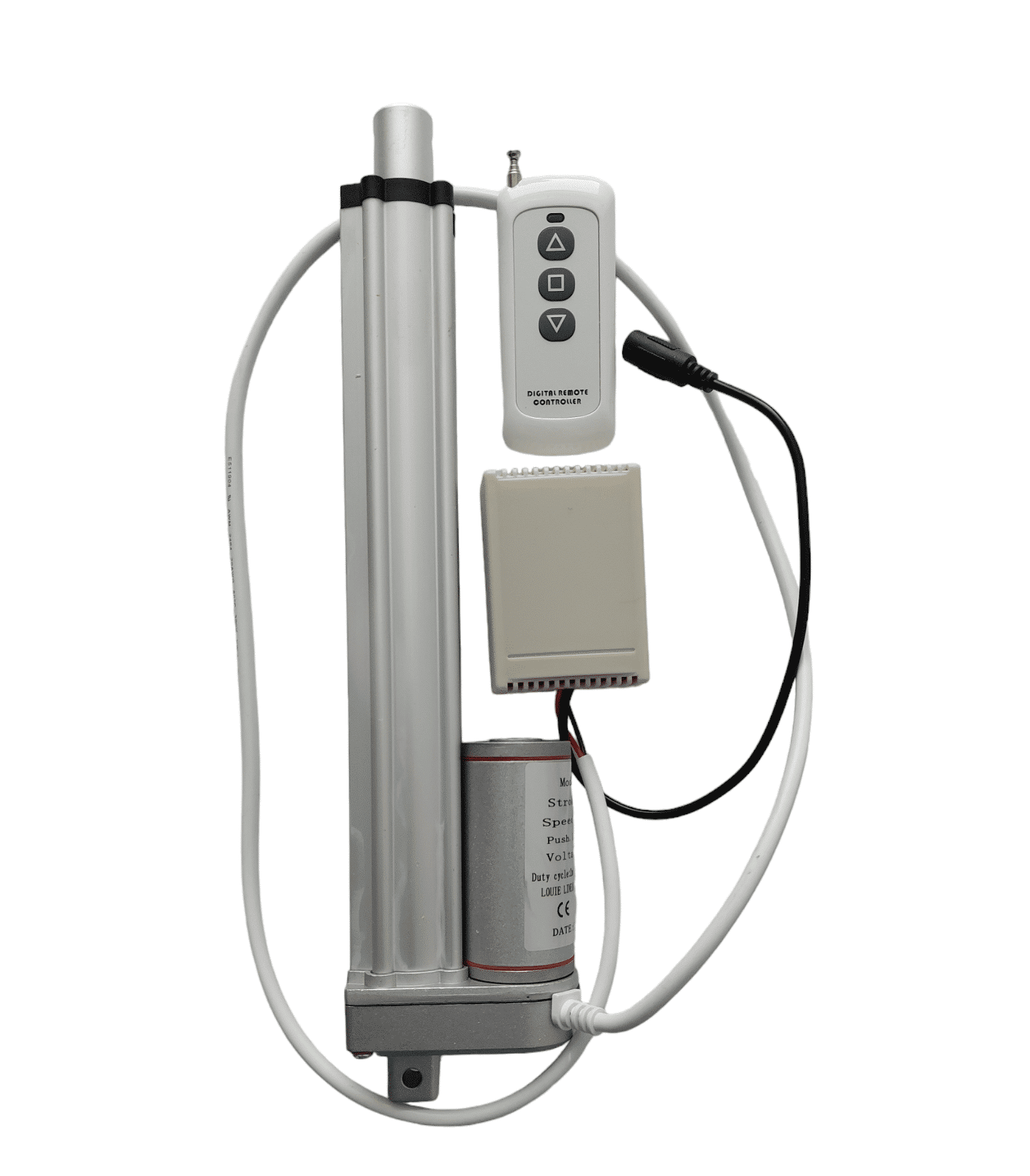 Lineaarimoottori  kauko-ohjattaus, 12 V/220V, 200 mm työntövarsi, rungon pituus/ kiinnityspisteiden väli tanko sisällä on noin 255 mm, tanko ulkona 455 mm, työntö-/vetovoina 700N noin 70 kg, nopeus 14 mm/s. Lineaarimoottori on roiskevesitiivis IP54.