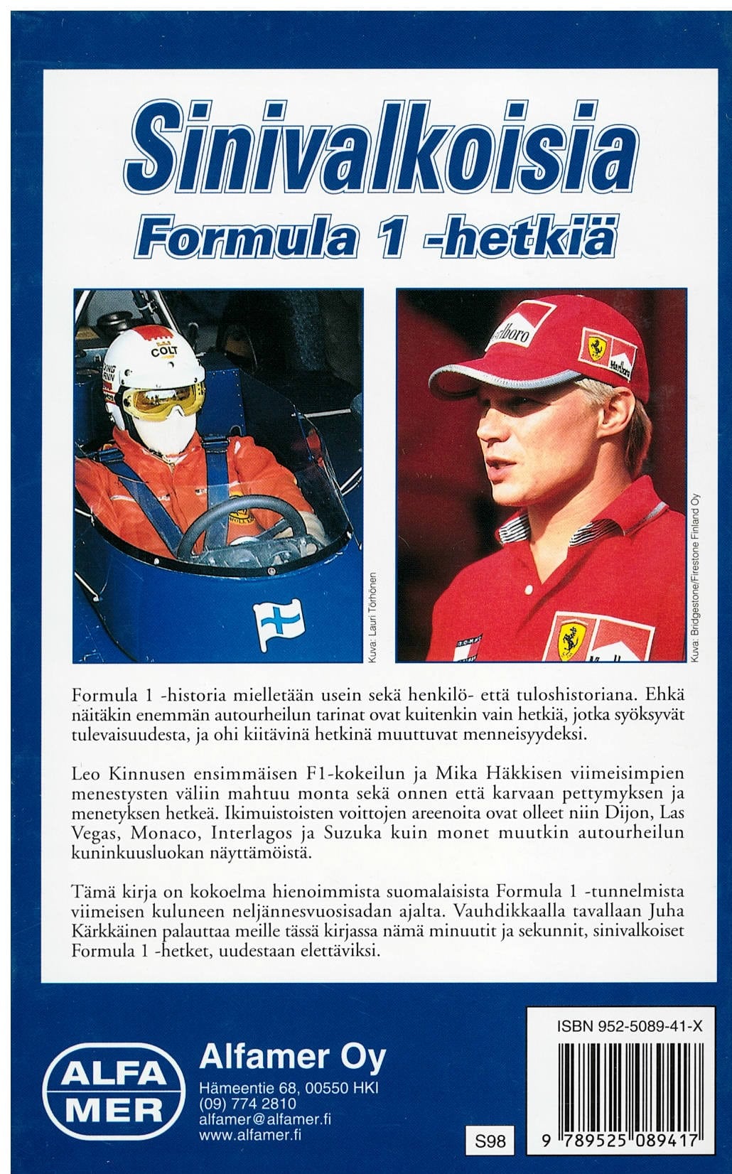 Sinivalkoisia Formula 1 hetkiä Alfamer -kirja Juha Kärkkäinen. Alfamer kustantamon kirja Sinivalkoisia Formula 1 kirja Juha Kärkkäinen
